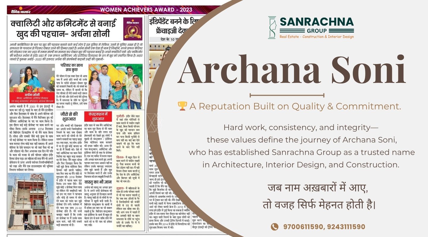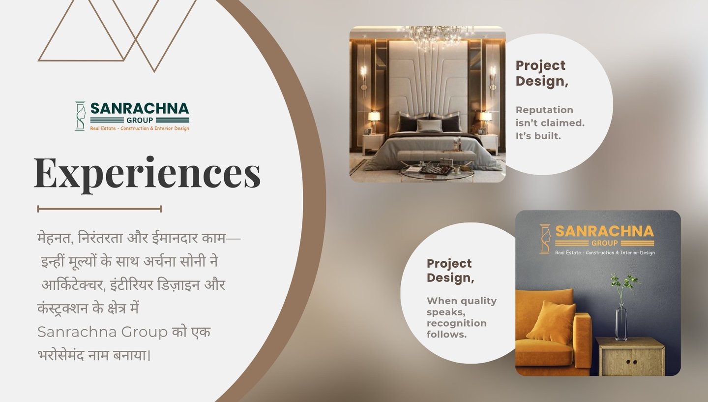 With a strong vision and dedication to excellence, Archana Soni has led Sanrachna Group towards delivering projects that reflect innovation, quality craftsmanship, and client satisfaction. Her commitment to creating thoughtfully designed spaces has helped the organization build a reputation for reliability and professionalism. Under her leadership, Sanrachna Group has grown steadily by focusing on creative architectural solutions, elegant interior designs, and strong construction standards. Each project represents a balance of aesthetic design, structural strength, and functional planning, ensuring long-term value for clients. Through continuous effort, passion for design, and a deep understanding of the industry, Archana Soni has transformed Sanrachna Group into a brand that stands for trust, excellence, and progressive development.